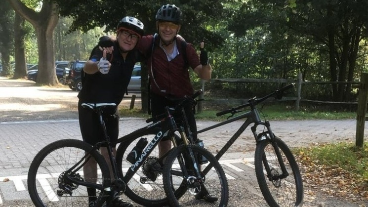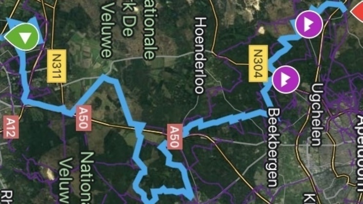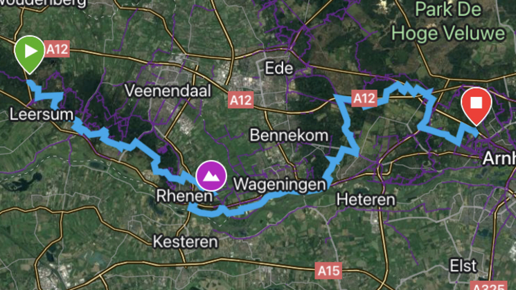 De dag begon heiig en dat gaf de route van etappe 2 in de ochtend een aparte en mooie sfeer. Wat ook opviel was de overgang van de Utrechtse Heuvelrug naar de Zuid-Veluwe: van strakke gravelpaden naar bospaden. Dus af en toe een beetje mul zand en wortels op de route. Maar Sjaak en ik hadden daar geen moeite mee.